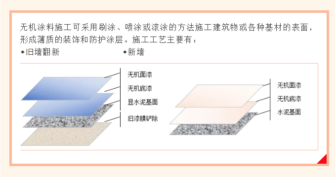 新墻面建議直接在水泥基面上施工無機涂料,因無機物質(zhì)與水泥基面形成穩(wěn)定的結(jié)構(gòu),使用防護功能及效果更佳。