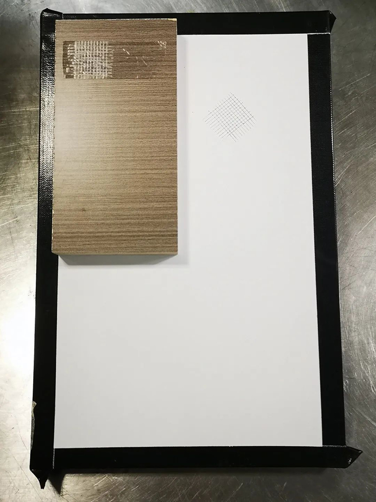 樣板10cm *15cm噴涂兩道110g/㎡,漆膜完全干燥后堆迭,放一個重壓槌(≒706g)在50℃下烘烤4hrs,取出冷卻分離,不可傷及漆膜。測試結果