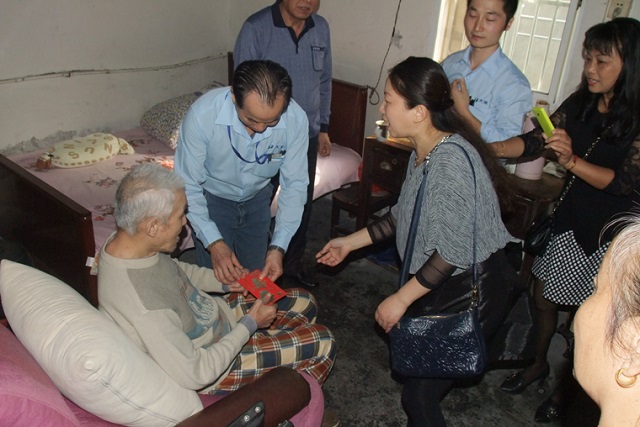 重陽節(jié)當(dāng)天,鎮(zhèn)黨委朱書記、社區(qū)委員和上海大寶管理部簡侑仕經(jīng)理、工程部林心旺顧問等一同前往當(dāng)?shù)鼐蠢显海赐繂柫岁懡ㄓⅰ㈥惒竦?位孤寡老人。他們當(dāng)中,年齡最大的近90歲高齡,最小的也有70多歲,因?yàn)闊o兒無女無所依靠,這些老人生活較為清苦,他們需要社會給予更多的關(guān)愛。