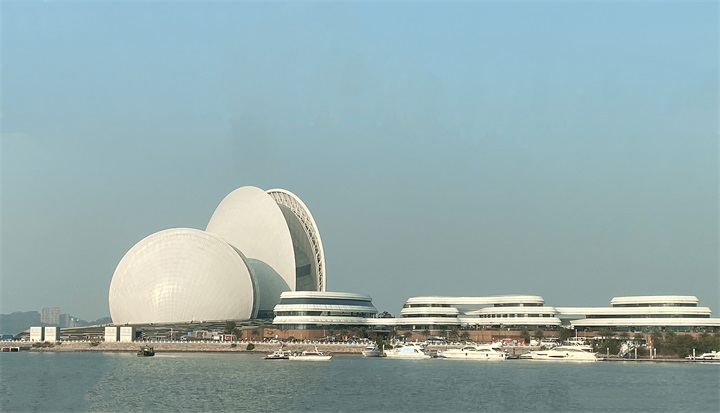 在餐廳用餐后,大家便前往珠海日月貝歌劇院。日月貝歌劇院是中國唯一建設在海島上的歌劇院,坐落于珠海情侶路野貍島海濱。大劇院建筑方案的創作構思源于大海,用地總體布局形似從海中升起的美麗魚鰭烘托著純凈的雙貝造型,形成“珠生于貝,貝生于海”的意境。在這里,大家或在拍照留念,或坐在陰涼處欣賞美景。
