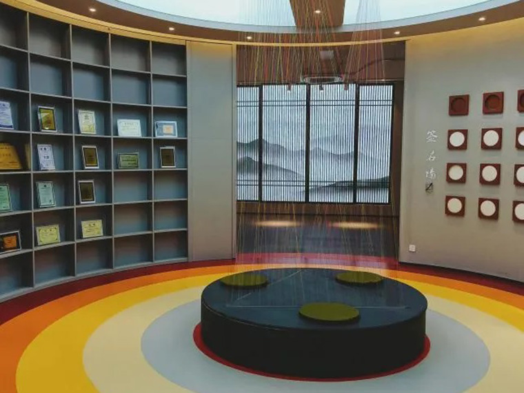 在隔出來的弧形展廳,一面墻展示著企業(yè)獲獎榮譽(yù)證書,一面墻是客戶的簽名展示區(qū)。