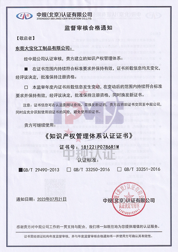 截至目前,東莞大寶化工制品有限公司已經擁有數百項知識產權,自2022年以來,公司已累計新增專利申請10項與新增發表的國際學術期刊文章。