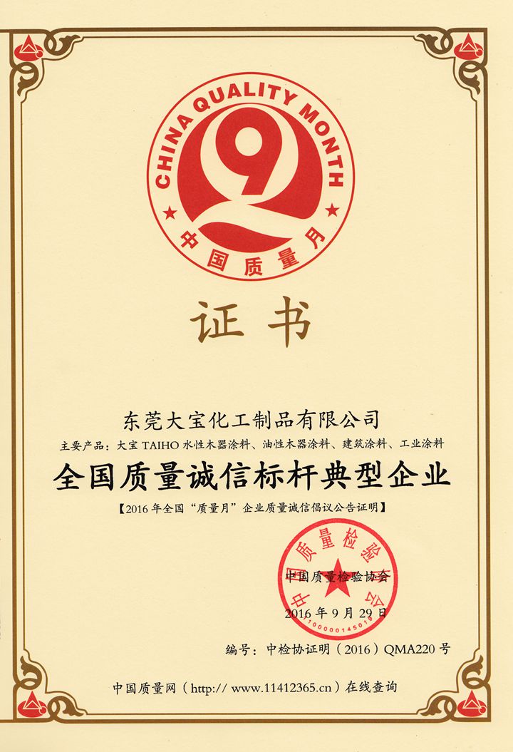 為推進建設質量強國,按照國務院辦公廳印發《貫徹實施質量發展綱要2016年行動計劃》的要求,并具體部署:中國質量檢驗協會繼續組織開展“企業質量誠信倡議”專題活動,助力“中國制造”品牌提升。中國質量檢驗協會組織開展的“企業質量誠信倡議”專題活動,對供給側改革、提升“中國制造”的品牌形象具有重要的意義,“全國質量誠信標桿典型企業”的授予,意味著大寶漆在企業誠信、產品質量上做的努力獲得了廣大消費者的認可!